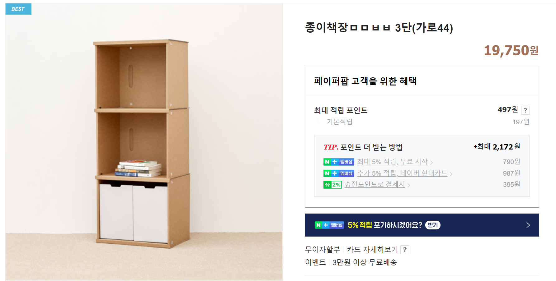 페이퍼팝 종이 책장 가격은 3단 (가로44) 기준으로 2만원이 조금 안됩니다.