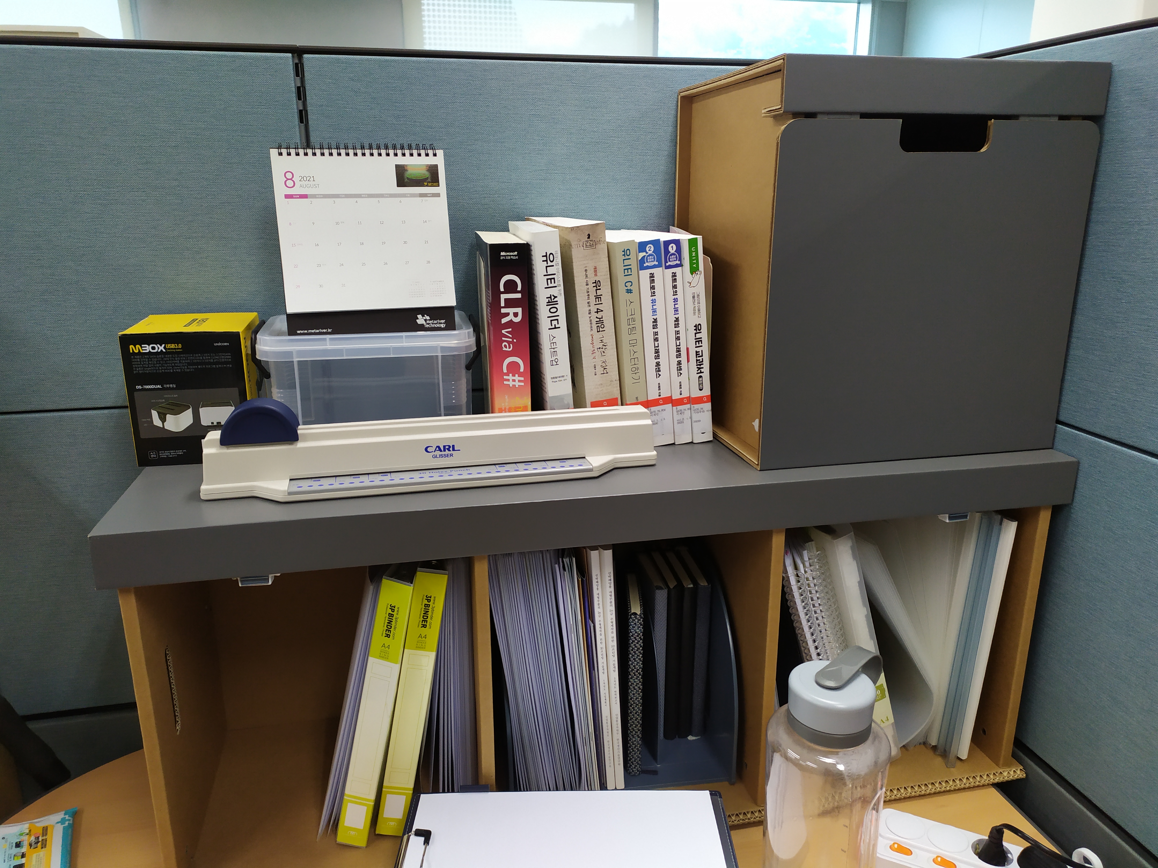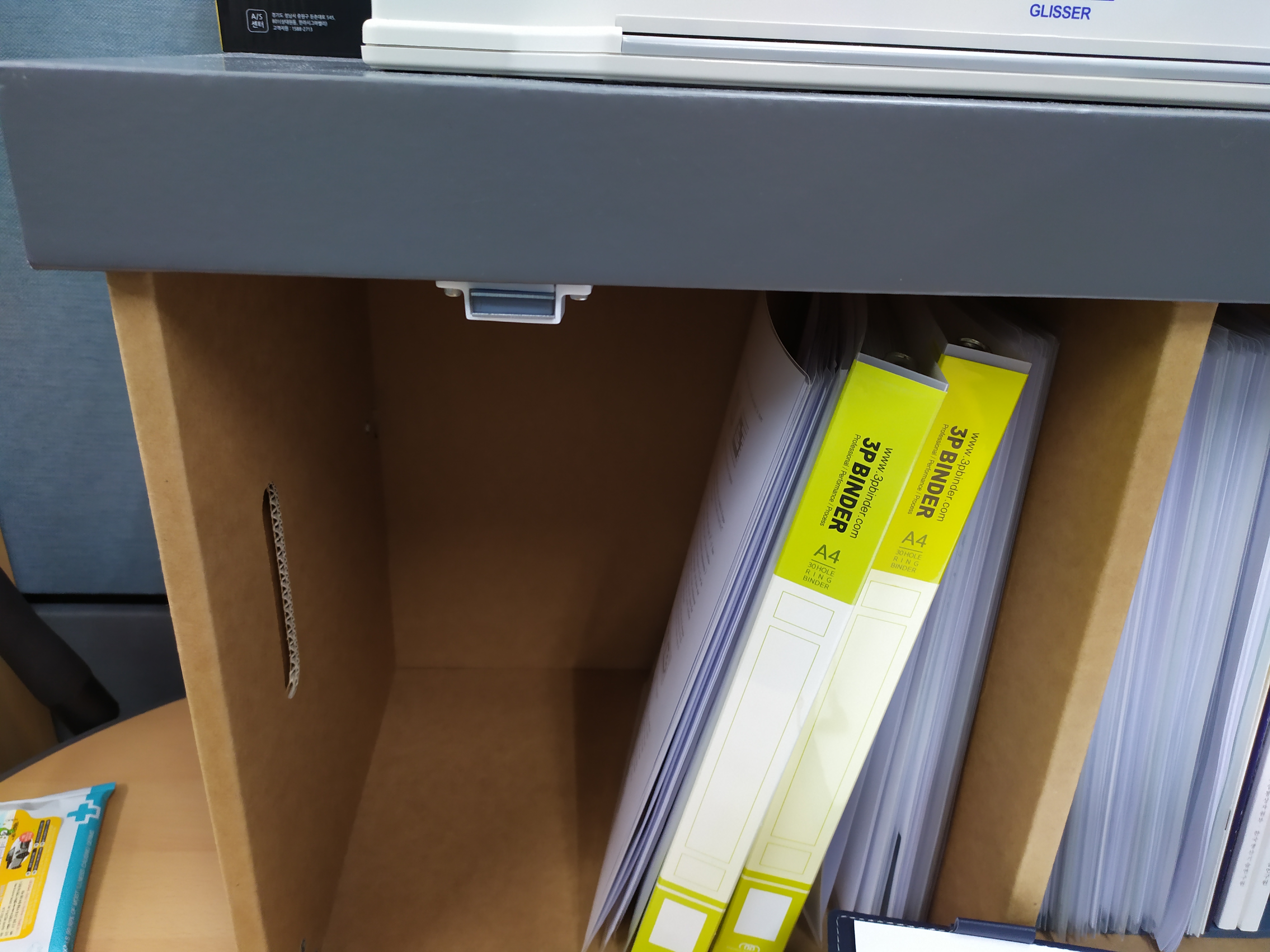 현재는 책상 위에 위치시키고, 그 안에 바인더들을 비치하였습니다.