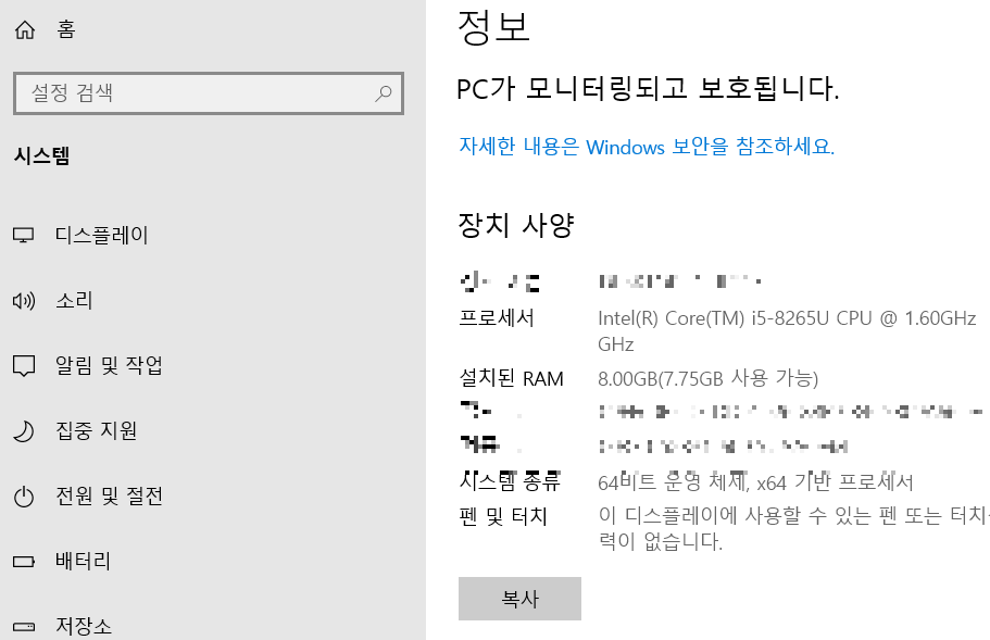 "윈도우즈 시작버튼 -> 내PC 로 검색 -> 속성 확인" 을 하면 아래와 같은 컴퓨터 정보를 알 수 있다.