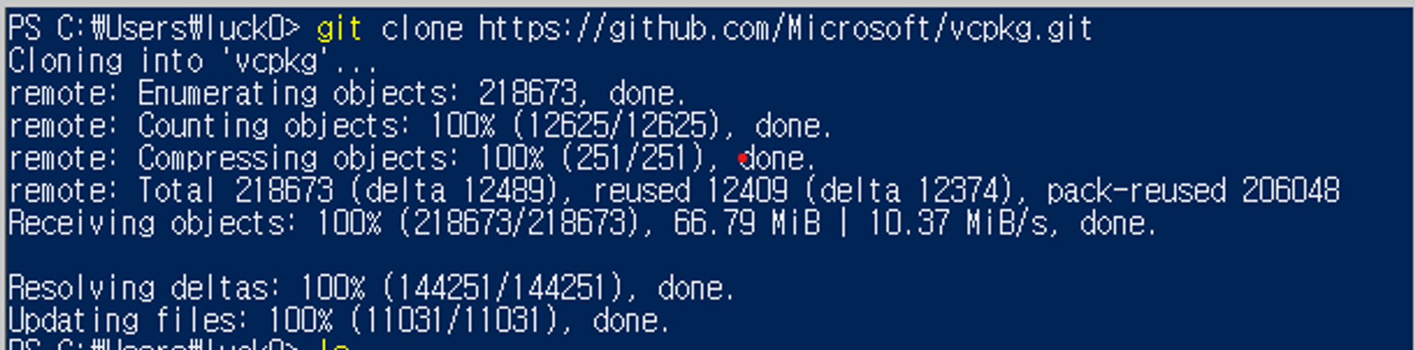 - git의 vcpkg 저장소 주소를 복사 붙여넣기하고, 엔터를 입력하여 git 저장소 파일 복제를 수행한다.