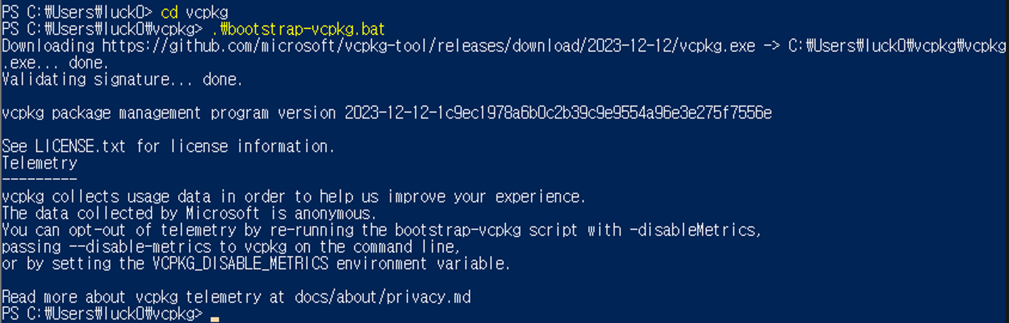 2단계 : 부트스트랩 스크립트를 실행하여 vcpkg를 빌드하는 단계.\vcpkg\bootstrap-vcpkg.bat