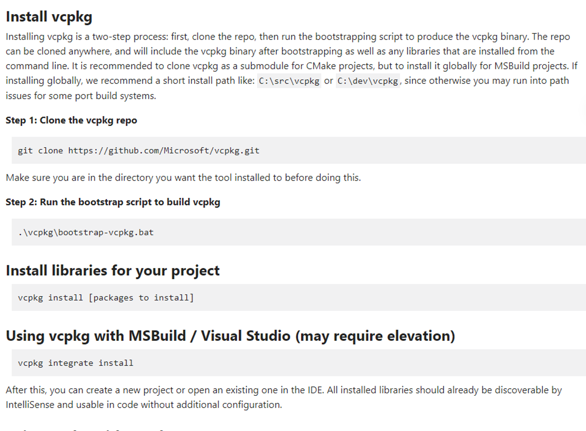 - vcpkg는 라이브러리 획득 및 관리를 위한 무료 C/C++ 패키지 관리자이다.